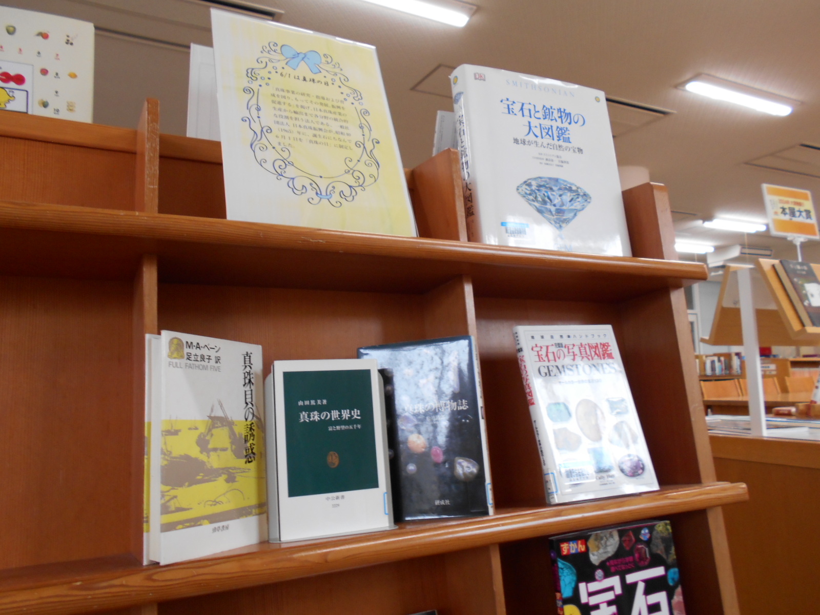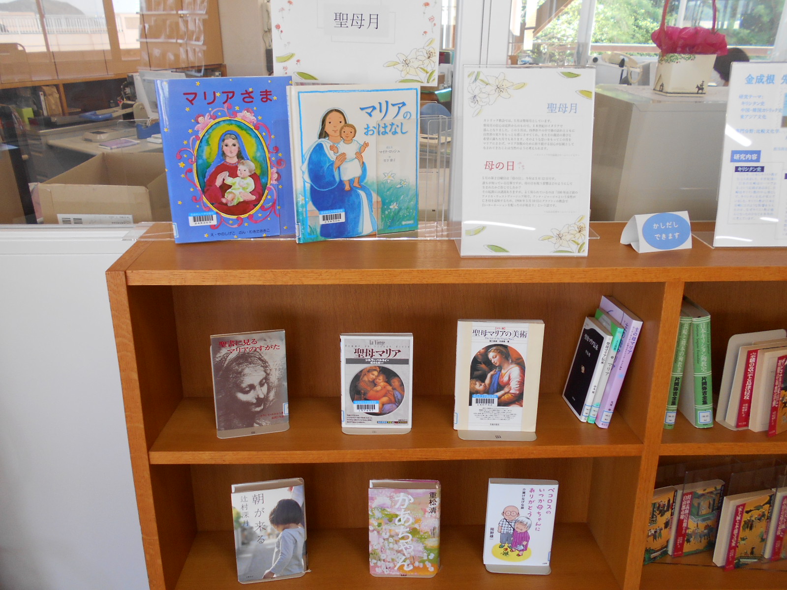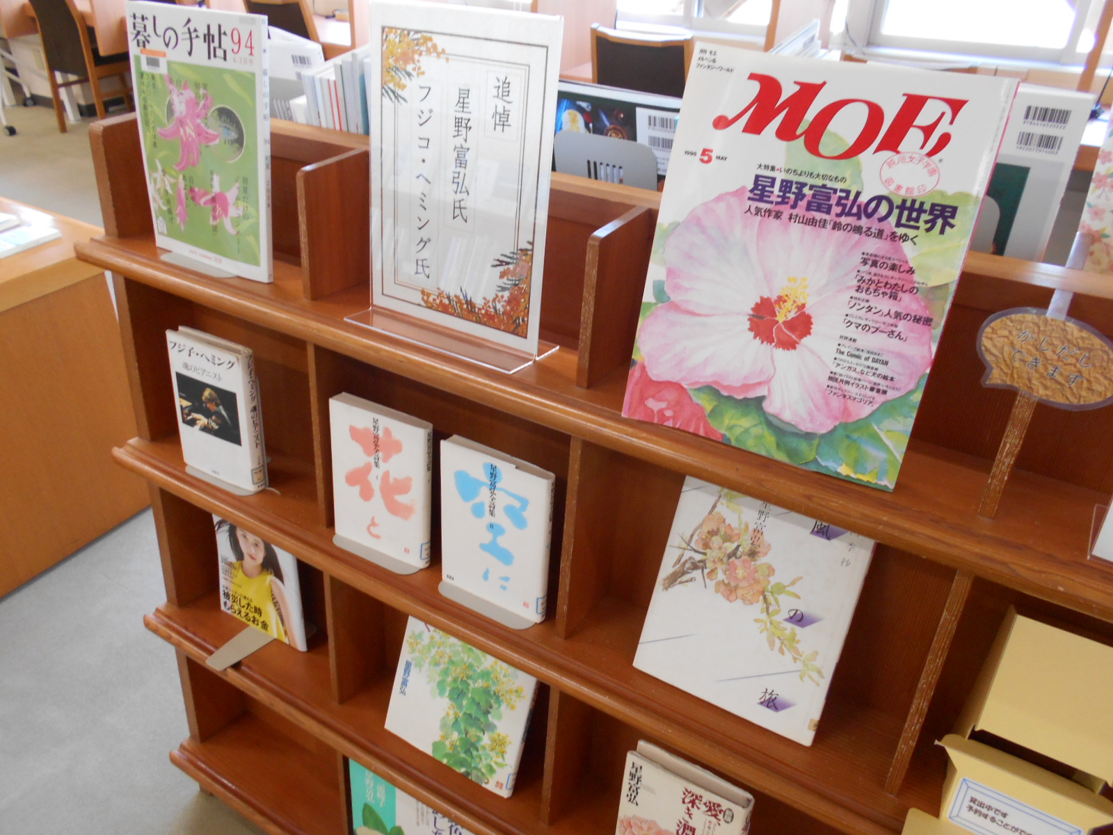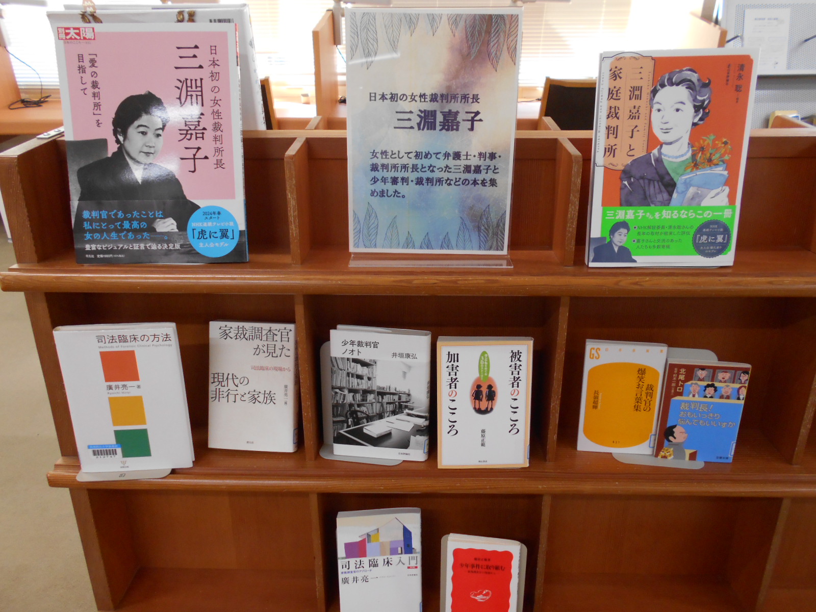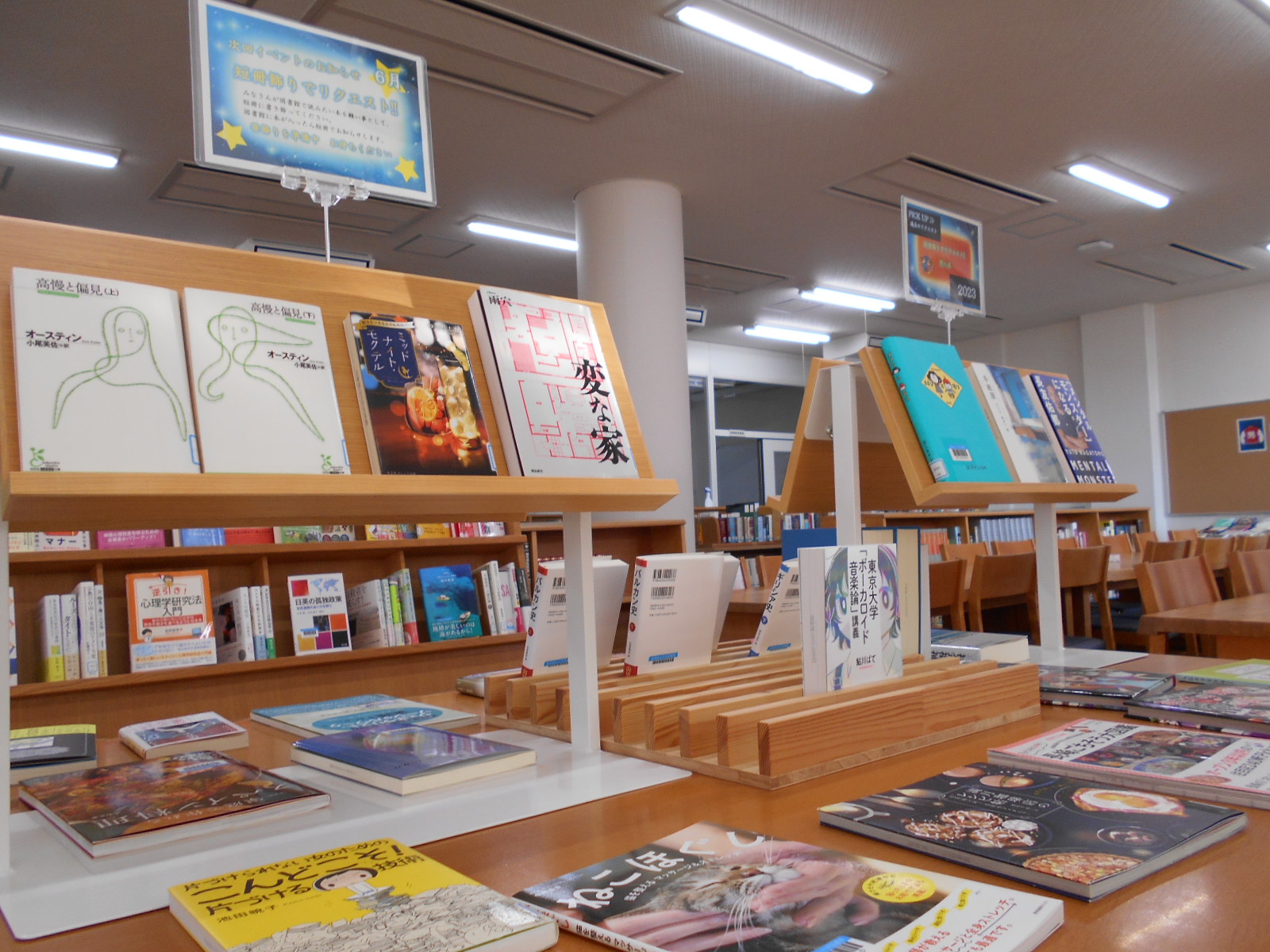 図書館カウンター前、季節?行事?最近の話題など、いま読みたい本を厳選して紹介しているスペースです。
