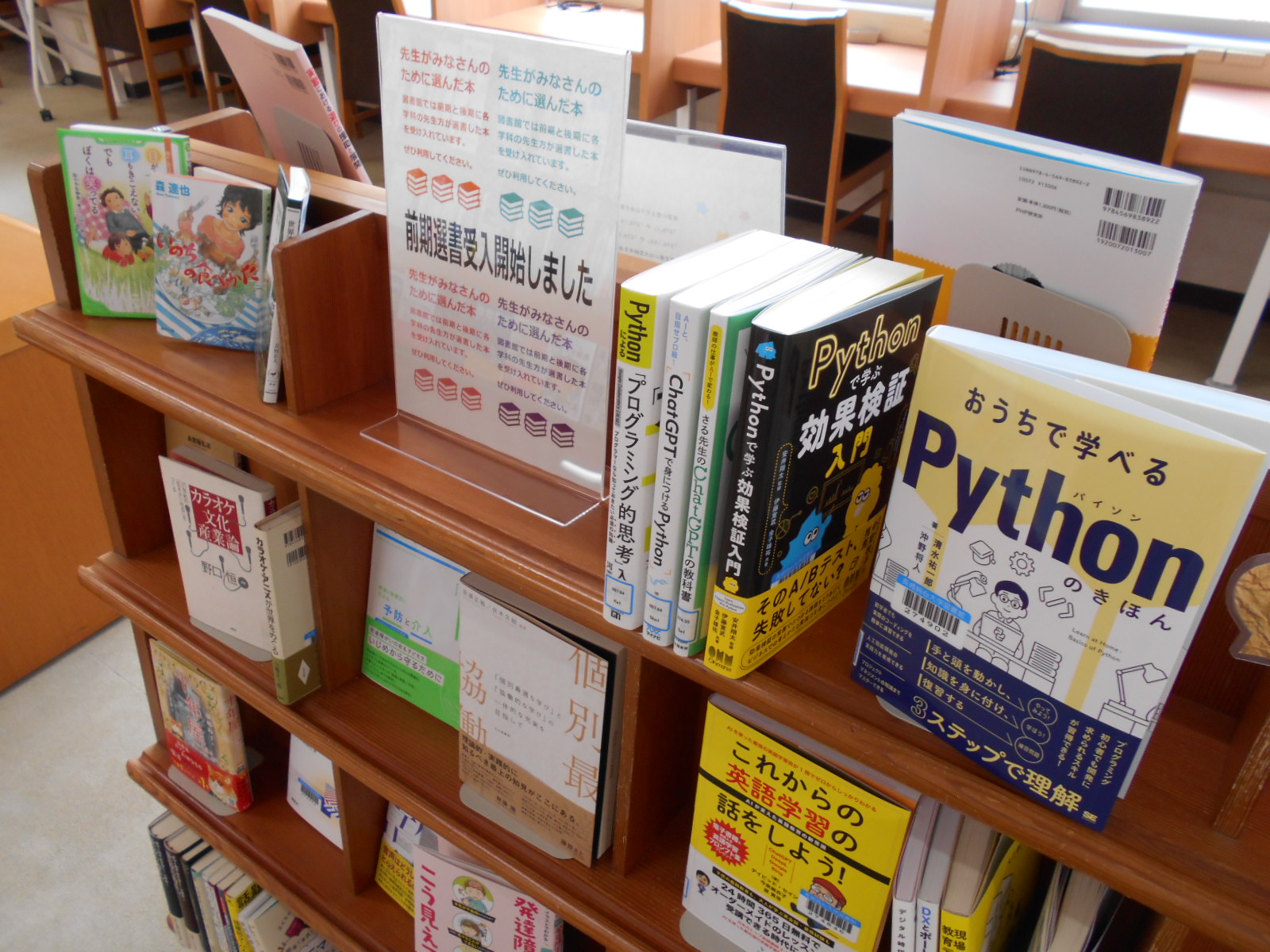 司書室のそばにある展示スペースです。こちらも気になる本棚と同様、時季にあう本を紹介しています。