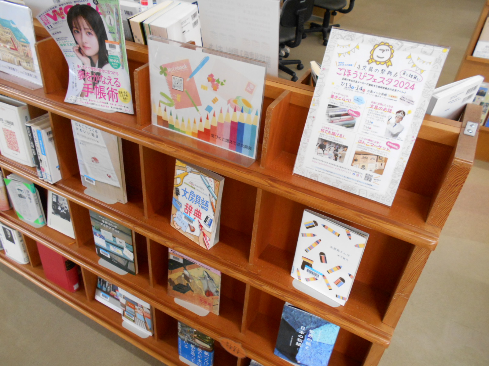館内には展示用ブックトラックや児童文庫手前の本棚など、ほかにも本の展示スペースを設けています。