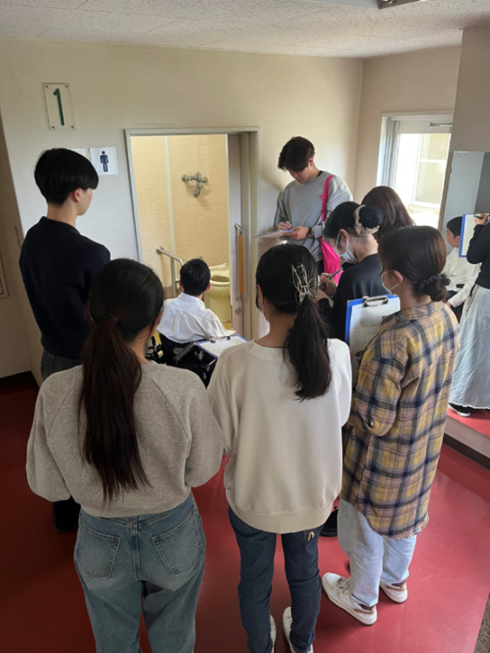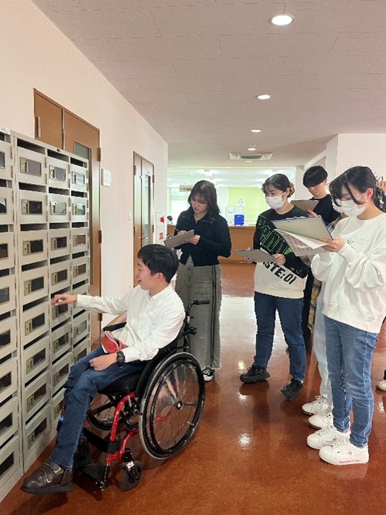 ケアワークコースの2年生は車いすユーザーの先輩と学内を散策したり、講義を聴いたりして車いすユーザーの大学生活について理解を深めました。